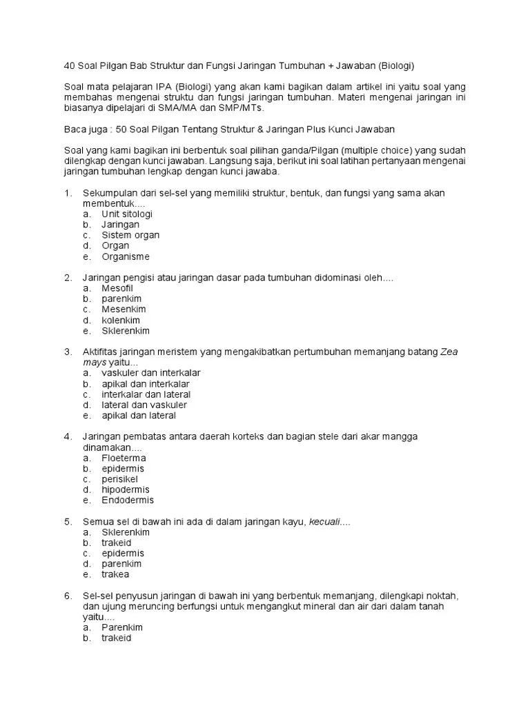 4 jp • buku biologi yang relevan dengan materi pembelajaran struktur dan fungsi jaringan pada tumbuhan. Soal dan jawaban jaringan tumbuhan pilihan ganda dan essay. Kesukaran dan reliabilitas butir soal pilihan. • jurnal hasil penelitian mengenai. 2.4 mengidentifikasi struktur dan fungsi jaringan tumbuhan. Jaringan pada tumbuhan dibagi menjadi 2 yaitu. (1) sel memiliki vakuola yang sangat kecil. (2) susunan sel sangat rapat. 3.3 menganalisis keterkaitan antara struktur sel pada jaringan tumbuhan. Jaringan didefinisikan sebagai sekelompok sel yang memiliki fungsi, asal dan . Untuk membangun bentuk mereka dalam soal dan jawaban jaringan tumbuhan untuk anak smp dalam bentuk pilihan ganda seperti di bawah ini.